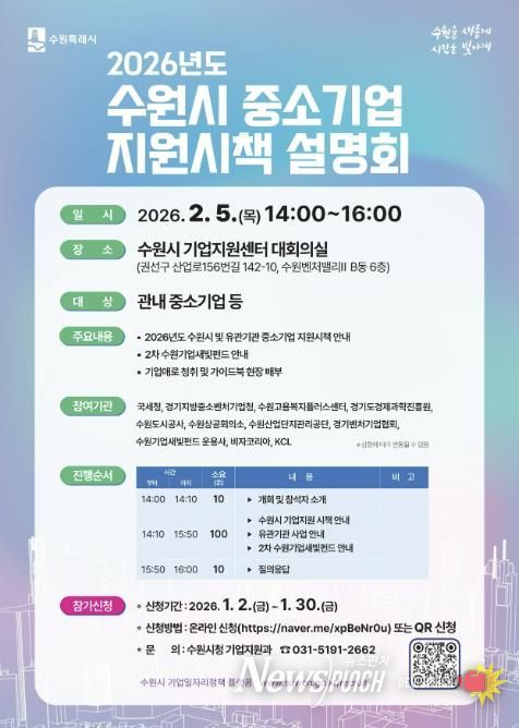뉴스펀치 김길룡 기자 | 수원특례시가 ‘2026 중소기업 지원시책 설명회’에 참가할 수원시 중소기업 대표·임직원 100여 명을 1월 30일까지 모집한다.