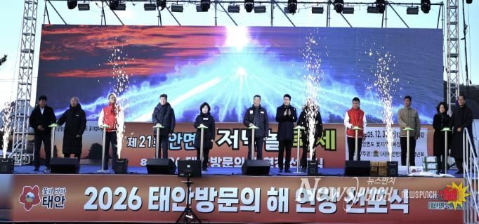 군은 국내 최고 관광휴양도시로의 힘찬 도약을 위해 지난 12월 31일 안면읍 꽃지해안공원 특설무대에서 제21회 안면도 저녁놀 축제를 겸한 ‘2026 태안 방문의 해 선포식’을 열고 두 번째 발걸음의 시작을 널리 알렸다고 밝혔다.