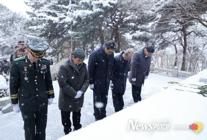 뉴스펀치 김길룡 기자 | 영암군이 병오년 새해를 맞은 2일 영암공원 충혼탑광장에서 보훈가족 등 100여 명이 참석한 가운데 신년 참배로 2026년 업무를 시작했다.