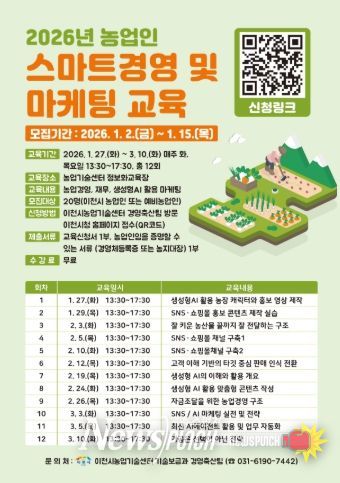 뉴스펀치 김길룡 기자 | 이천시농업기술센터는 농업인의 디지털 경쟁력 강화와 경영 안정, 판로 확대를 위해 ‘2026년 농업인 스마트경영 및 마케팅 교육’의 교육생을 오는 1월 15일까지 모집한다고 밝혔다.