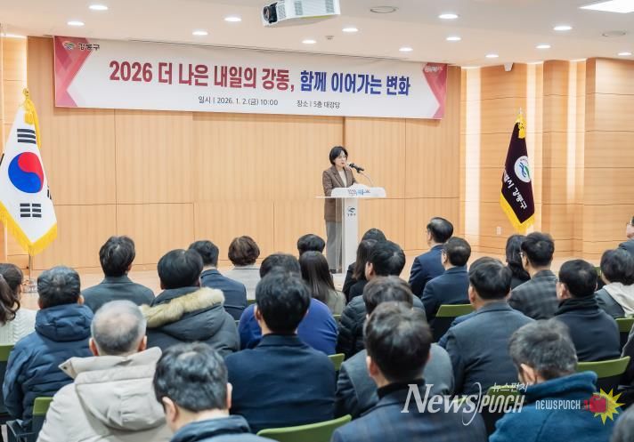 뉴스펀치 김완규 기자 | 서울 강동구는 1월 2일 구청 대강당에서 2026년 새해를 맞아 시무식을 열고, 새해 구정 운영 방향과 공직자로서의 역할과 자세를 공유했다.