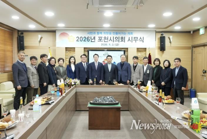 뉴스펀치 김길룡 기자 | 포천시의회는 2일, 의회 2층 의원회의실에서 2026년 병오년(丙午年) 새해를 맞는 시무식을 개최하고 본격적인 의정활동에 돌입했다.