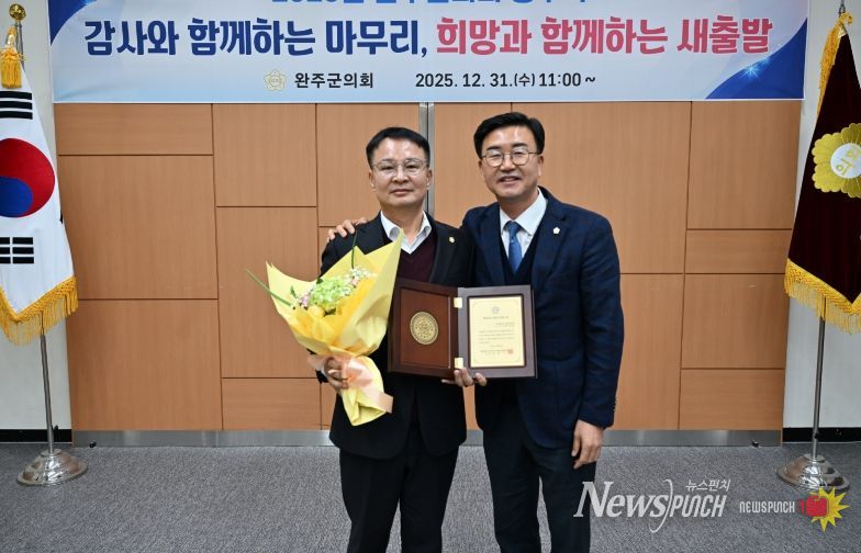 뉴스펀치 김길룡 기자 | 완주군의회 김재천 부의장이 지난달 31일, 완주군의회 문화강좌실에서 열린 완주군의회 2025년도 종무식에서 대한민국 지방의정봉사상을 수상했다.