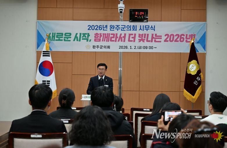 뉴스펀치 김길룡 기자 | 완주군의회는 2일, 의회 문화강좌실에서 2026년 시무식을 열고 새해 의정활동의 힘찬 출발을 알렸다.