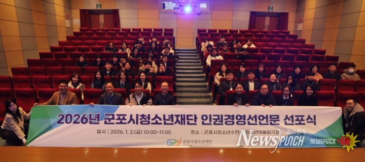 뉴스펀치 박상훈 기자 | 군포시청소년재단은 2026년 1월 2일, 군포시청소년수련관 4층 청소년어울림 극장에서 전 직원 대상 인권경영 선언문 선포식을 개최했다. 이번 행사는 재단 임직원 모두가 참여하여, 새해를 맞아 조직 내 인권경영 실천 의지를 공유하고 상호 존중과 인권 존중의 문화를 강화하기 위해 마련됐다.