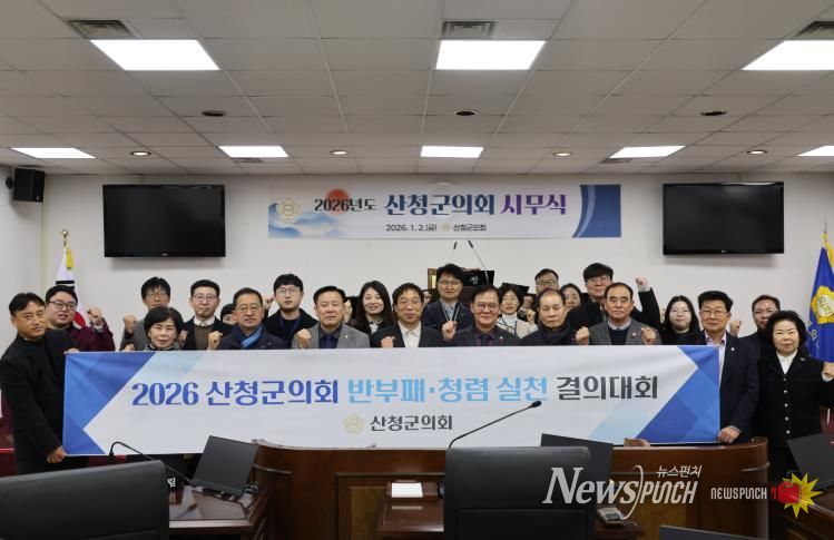 뉴스펀치 박세훈 기자 | 산청군의회는 2026년 새해를 맞아 1월 2일 오전 의회 본회의장에서 ‘2026년 시무식 및 반부패·청렴 실천 결의대회’를 개최하고, 군민에게 신뢰받는 의정 구현과 공직사회의 청렴문화 확산을 다짐했다.