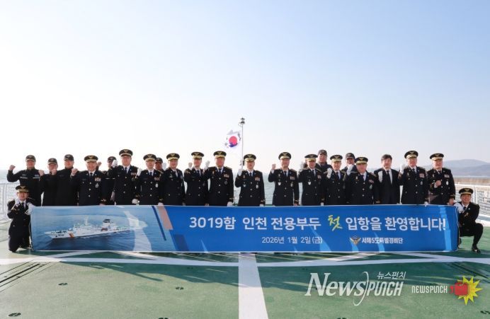 뉴스펀치 정홍균 기자 | 중부지방해양경찰청 서해5도특별경비단은 2일 최신형 3,000톤급 경비함정인 3019함이 불법 외국어선 단속 업무를 위해 인천 해양경찰 전용부두에 첫 입항했다고 밝혔다.