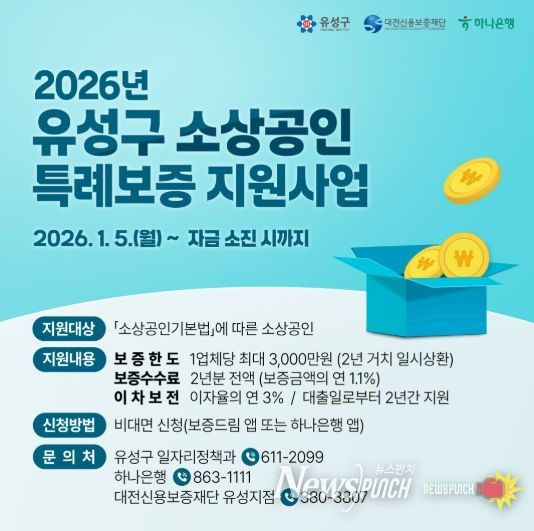 뉴스펀치 이현승 기자 | 대전 유성구는 소상공인과 창업 기업의 금융 부담 완화를 위해 ‘2026년도 소상공인·창업 특례 보증 지원 사업’을 운영한다.