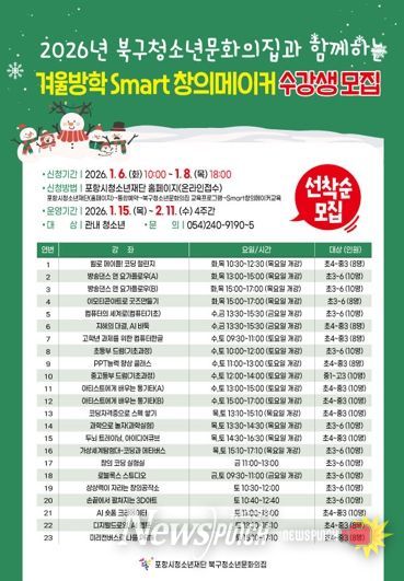뉴스펀치 박세훈 기자 | 포항시청소년재단 북구청소년문화의집은 오는 6일부터 청소년들의 창의력 향상과 진로 체험을 위한 겨울방학 특별 프로그램 ‘Smart 창의메이커’ 참가자를 모집한다.
