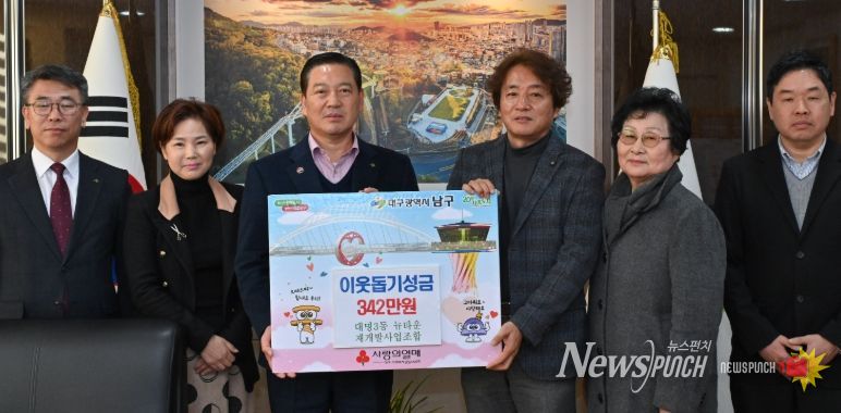뉴스펀치 조평훈 기자 | 대구 남구는 대명3동 뉴타운 재개발사업 조합의 조합장(이대룡)을 비롯한 임원, 대의원 및 직원이 지난 2025년 12월 30일 연말을 맞아 어려운 이웃을 위해 써달라며 정성껏 모은 성금 342만원을 기탁했다고 밝혔다.