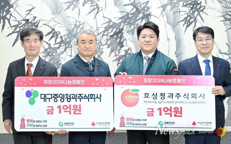 뉴스펀치 조평훈 기자 | 대구농수산물도매시장 법인 대구중앙청과㈜(대표 이용우, 이상윤)와 효성청과㈜(대표 김형수)는 1월 5일 대구광역시청 동인청사 접견실에서 대구사회복지공동모금회를 통해 총 2억 원(각 1억 원)의 희망 나눔 성금을 전달했다.
