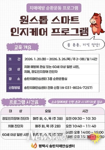 뉴스펀치 박상훈 기자 | 평택시 송탄치매안심센터에서는 치매 예방 및 인지기능 향상을 위한 ‘원스톱 스마트 인지케어 프로그램’ 1기 참여자를 오는 14일까지 모집한다.
