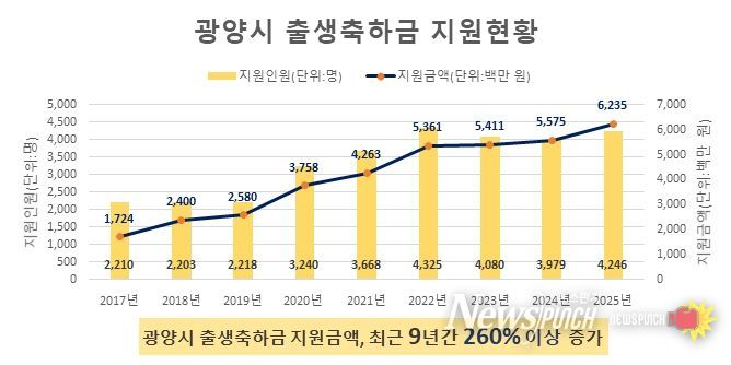 광양시의 출생축하금 지원 예산은 최근 9년 사이 크게 늘었다. 시에 따르면 2017년에는 17억 2,400만 원을 편성해 2,210명에게 지원했으며, 2025년에는 62억 3,500만 원을 투입해 4,246명에게 지원했다. 예산 기준으로 약 260% 이상 증가한 규모다.