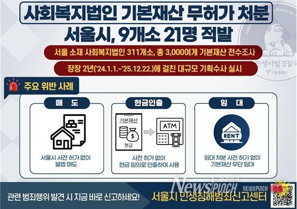 뉴스펀치 박상훈 기자 | 서울시 특별사법경찰 전담조직인 민생사법경찰국은 사회복지법인의 기본재산을 시·도지사 허가 없이 임의로 매도·임대 등 처분한 사회복지법인 9개소, 21명을 적발하여 수사 중이라고 밝혔다.