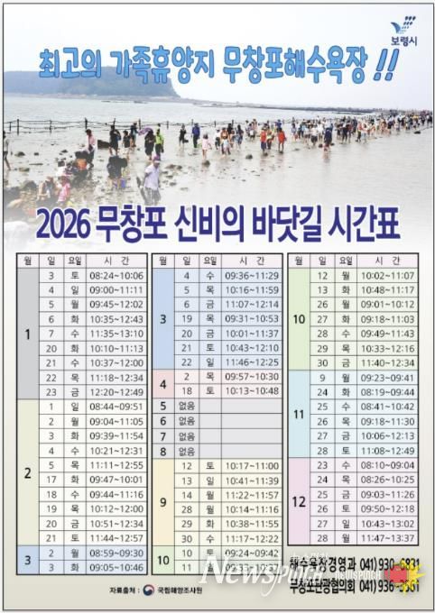 뉴스펀치 이현승 기자 | 보령시가 2026년 무창포 해수욕장 신비의 바닷길 시간표를 안내하며 관광객들의 방문을 환영한다고 전했다.