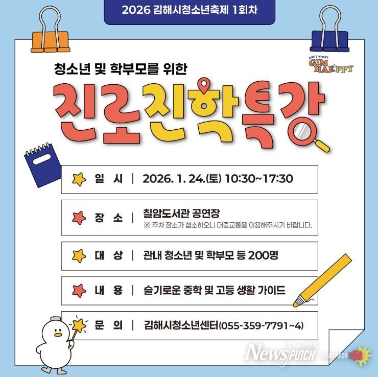 뉴스펀치 박세훈 기자 | 김해시청소년센터는 오는 24일 칠암도서관 공연장에서 청소년과 학부모를 위한 ‘2026 청소년 진로·진학특강’을 개최한다고