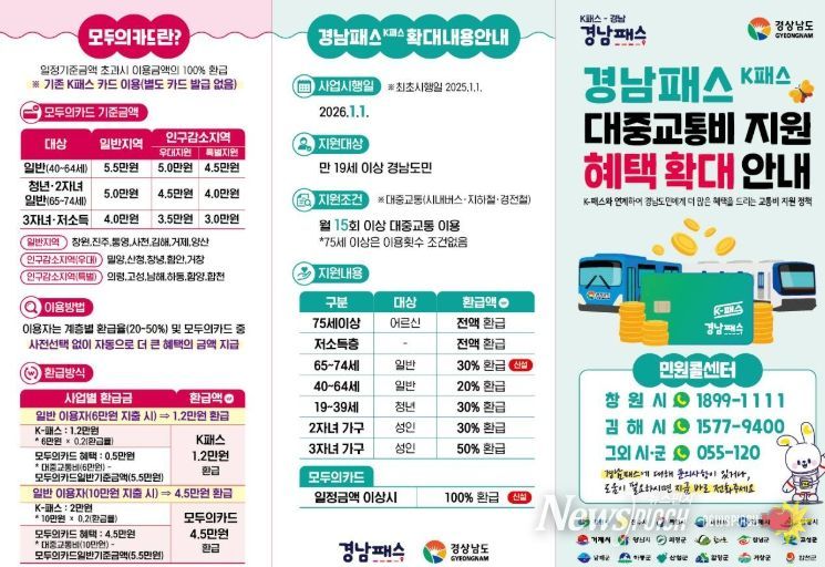 ‘K-패스(경남패스)’는 19세 이상 시민을 대상으로, 월 15회 이상 대중교통을 이용하면 이용 실적에 따라 교통비를 환급받을 수 있는 제도이며, 75세 이상 어르신은 이용 횟수에 제한 없이 혜택을 받을 수 있다.