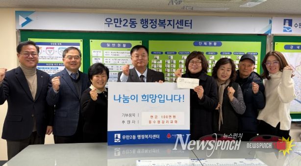 뉴스펀치 박상훈 기자 | 수원시 팔달구 우만2동 지역사회보장협의체는 지난 5일, 동수원감리교회와 함께 관내 취약계층을 지원하기 위한 후원금 전달식을 진행했다.
