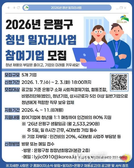 뉴스펀치 박상훈 기자 | 서울 은평구는 7일부터 내달 3일까지 ‘2026년 청년 일자리사업’에 참여할 기업을 모집한다고 밝혔다.