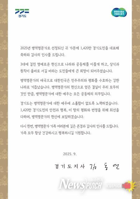 김동연 경기도지사는 서한문을 통해 “병역명문가의 애국으로 대한민국은 민주주의와 평화를 수호하는 강한 나라로 거듭났다”면서 “경기도는 병역명문가에 대한 예우에 소홀함이 없도록 노력하겠으며, 헌신에 보답하겠다”고 감사와 존경의 뜻을 표현했다.