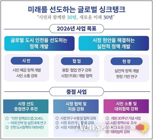 이에 따라 2026년 사업 목표를 “글로벌 도시 인천을 선도하고, 시정 현안을 해결하는 실천적 정책 개발”로 정하고, ▲미래 아젠다 발굴 및 시정 선도 연구 강화, ▲시정 협력 및 지원 기능 고도화, ▲시민 소통과 대외협력 강화 등을 중점적으로 추진할 계획이다.