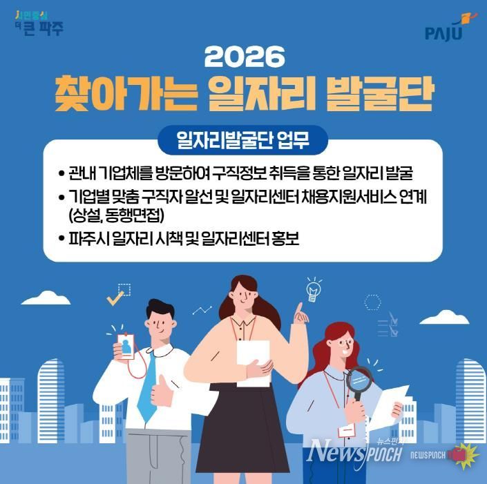뉴스펀치 박상훈 기자 | 파주시는 파주형 희망일자리 사업의 일환으로 추진 중인 ‘찾아가는 일자리발굴단’활동에 참여할 기간제 근로자 2명을 모집한다.