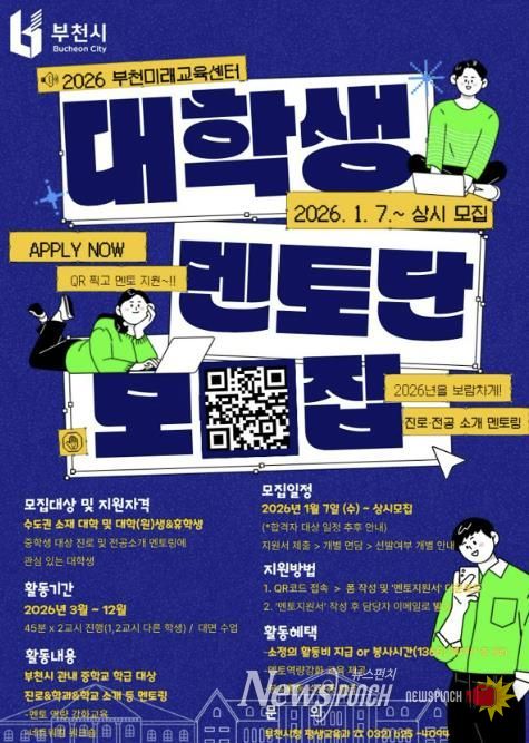 뉴스펀치 박상훈 기자 | 부천시는 청소년의 자기주도 진로 설계 역량 강화를 위해 1월 7일부터 연중 상시로 ‘청년진로멘토링 프로그램’을 운영하며, 함께할 대학생 멘토를 모집한다.