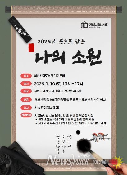 뉴스펀치 박상훈 기자 | 이천시립도서관은 2026년 병오년 새해를 맞아 시민의 한 해 소망과 다짐을 서예가가 붓글씨로 써주는 '2026년 붓으로 담은 ‘나의 소원’' 행사를 오는 1월 10일 오후 1시부터 5시까지 시립도서관 1층 책마당 로비에서 운영한다.