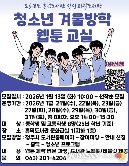 뉴스펀치 이현승 기자 | 청주흥덕도서관은 겨울방학을 맞은 청소년들의 창의력과 표현력을 키우기 위한 ‘청소년 겨울방학 웹툰 공작소’ 참가자를 모집한다고 8일 밝혔다.