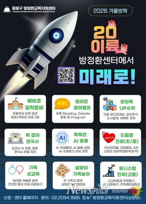 뉴스펀치 박상훈 기자 | 중랑구 방정환교육지원센터가 2026년 겨울방학을 맞아 학생과 학부모를 위한 특화 교육 프로그램 ‘20이륙(2026), 방정환센터에서 미래로!’를 운영한다.