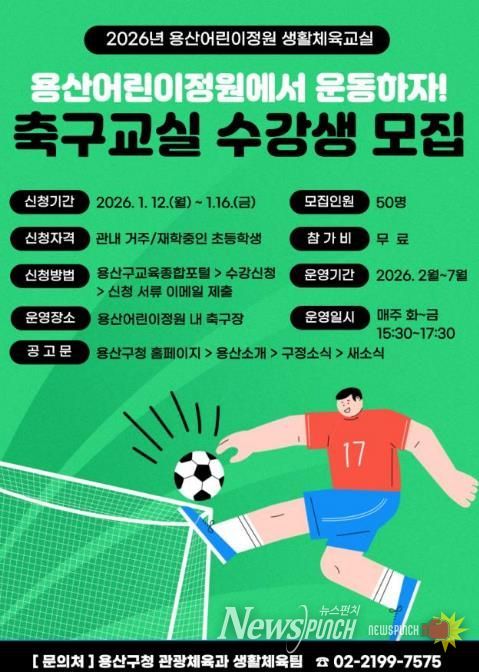 뉴스펀치 박상훈 기자 | 서울 용산구가 유아 및 유소년의 건강한 성장 지원과 생활체육 참여 기회 확대를 위해 오는 2월부터 7월까지 ‘용산어린이정원 생활체육교실(축구)’을 운영한다.