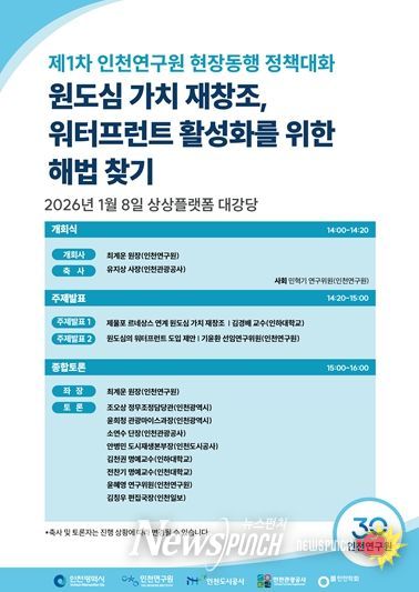 뉴스펀치 정홍균 기자 | 인천연구원은 인천학회와 함께 1월 8일 제물포 상상플랫폼에서 정책 세미나를 공동 주최한다.