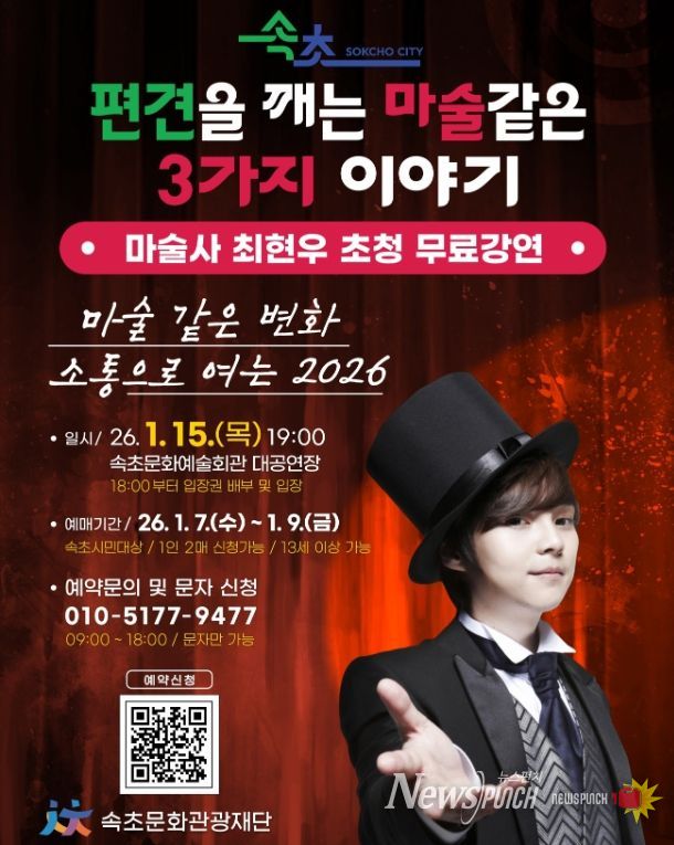 뉴스펀치 조평훈 기자 | (재)속초문화관광재단은 오는 2026년 1월 15일 속초문화예술회관 대공연장에서 대한민국을 대표하는 마술사 최현우를 초청해 시민 대상 특별 강연을 개최한다.