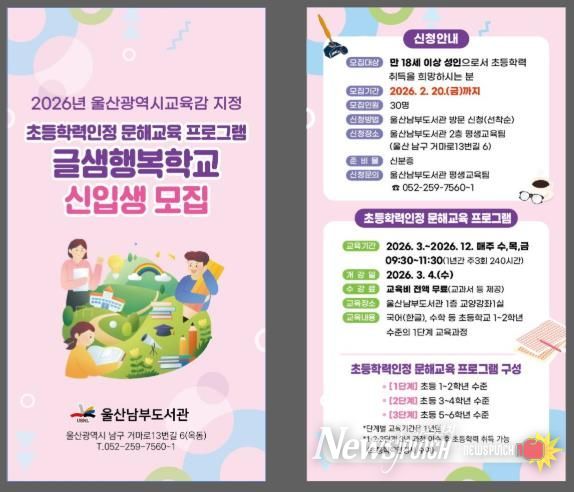 뉴스펀치 김윤걸 기자 | 울산남부도서관은 배움의 시기를 놓친 성인들에게 정규 학력 취득의 기회를 제공하는 문해교육 프로그램 ‘글샘행복학교’의 신입생을 모집한다.