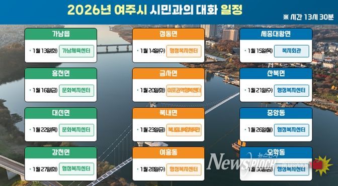 ‘2026년 시민과의 대화’는 △2026.1.13.(가남읍, 가남체육센터) △2026.1.14.(점동면, 행정복지센터) △2026.1.15.(세종대왕면, 복지회관) △2026.1.16.(흥천면, 문화복지센터) △2026.1.20.(금사면, 이포권역행복센터) △2026.1.21.(산북면, 행정복지센터) △2026.1.22.(대신면, 문화복지센터) △2026.1.23.(북내면, 북내실내복합체육관) △2026.1.26.(중앙동, 행정복지센터) △2026.1.27.(강천면, 행정복지센터) △2026.1.28.(여흥동, 여흥체육공원 실내체육관) △2026.1.30.(오학동, 행정복지센터) 순으로 진행된다.