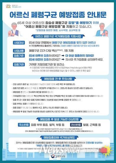 65세 이상 폐렴구균 예방접종 사업은 침습성 폐렴구균 감염증을 예방하기 위해 ‘폐렴구균 23가 다당백신(PPSV23)’을 평생 1회 무료 접종을 지원한다.