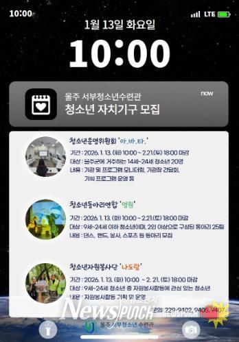 뉴스펀치 김윤걸 기자 | 울주군시설관리공단 서부청소년수련관은 청소년의 참여 활성화와 자치 역량 강화를 위해 2026년도 청소년 자치기구 신규 참여 청소년을 모집한다고 밝혔다.