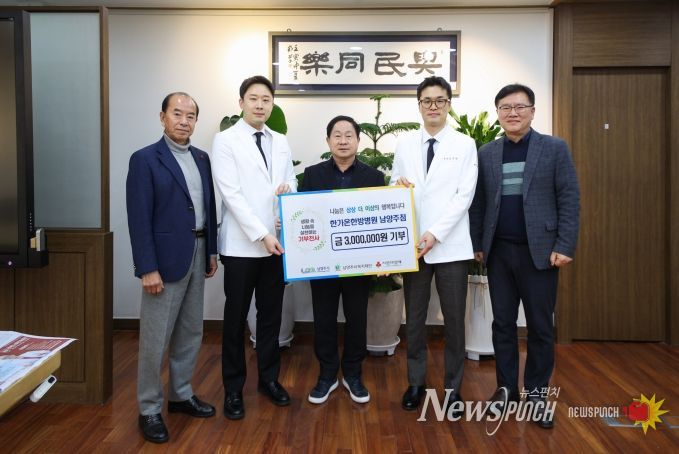 뉴스펀치 박상훈 기자 | 남양주시는 8일 호평동 한가온한방병원 남양주점(대표원장 김주찬, 전찬구)이 지역 내 취약계층 지원을 위해 후원금 300만 원을 기탁했다고 밝혔다.