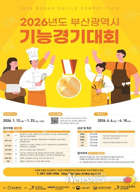 뉴스펀치 김윤걸 기자 | 부산시 기능경기위원회는 '2026년도 부산시 기능경기대회'에 참가할 숙련기술인을 모집한다고 밝혔다.
