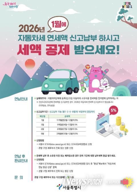 구로구 관계자는 “자동차세를 1월에 연납할 경우 가장 많은 세액 공제 혜택을 받을 수 있는 만큼, 구민 여러분의 많은 관심과 신청을 바란다”고 말했다.