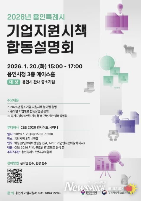 뉴스펀치 박상훈 기자 | 용인특례시는 오는 20일 오후 3시 시청 에이스홀에서 ‘2026년 중소기업 지원시책 합동설명회’를 개최한다고 9일 밝혔다.