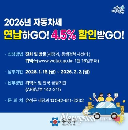 뉴스펀치 이현승 기자 | 대전 유성구는 1월 16일부터 2월 2일까지 자동차세를 미리 내면 세액을 공제받을 수 있는 ‘자동차세 연납 제도’를 운영한다.