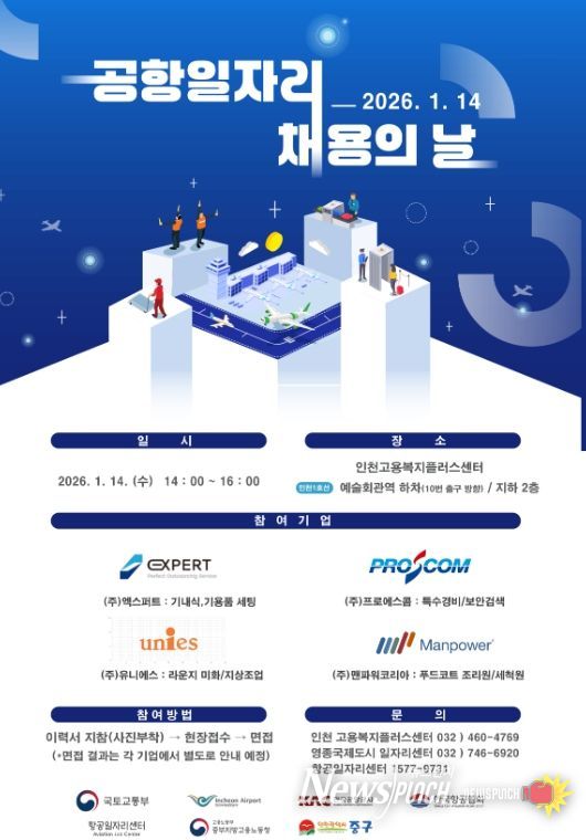 뉴스펀치 조평훈 기자 | 인천시 중구는 오는 14일 구월동 소재 인천고용복지플러스센터 지하 2층 채용행사장(남동구 문화로 131)에서 ‘2026년도 제1회 공항일자리 채용의 날’ 행사를 개최한다.