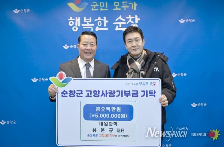 뉴스펀치 정홍균 기자 | 순창군은 9일 대일화학 유운규 대표가 고향사랑기부금 500만원을 기탁했다고 밝혔다.