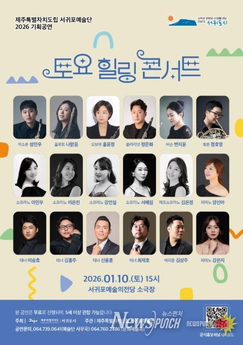 뉴스펀치 김용희 기자 | 서귀포시는 10일 15시 서귀포예술의전당 소극장에서 도립서귀포예술단의 기획 공연 ‘2026 즐거운 주말 ! 토요 힐링 콘서트’를 개최한다.