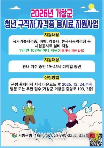 뉴스펀치 박세훈 기자 | 거창군은 미취업 청년의 취업 역량 강화와 경제적 부담 완화를 위해 각종 자격증 시험 응시료를 지원한다.