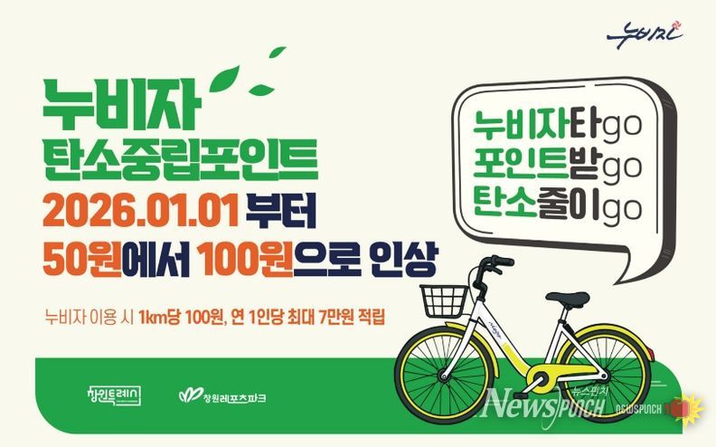 뉴스펀치 박세훈 기자 | 창원특례시는 공영자전거 “누비자” 이용 시민에게 지급하는 탄소중립포인트 인센티브가 2026년 1월 1일부터 1km당 50원에서 100원으로 인상된다고 밝혔다.