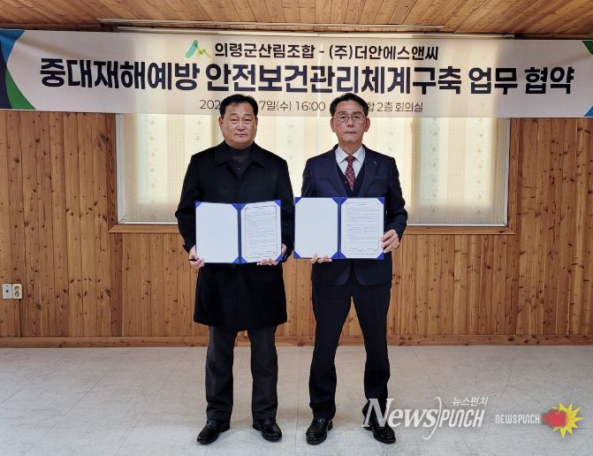 뉴스펀치 박세훈 기자 | 의령군산림조합은 지난 7일 산림조합 2층 회의실에서 ㈜더안에스엔씨와 중대재해 예방을 위한 안전보건관리체계 구축 업무협약을 체결했다고 밝혔다.