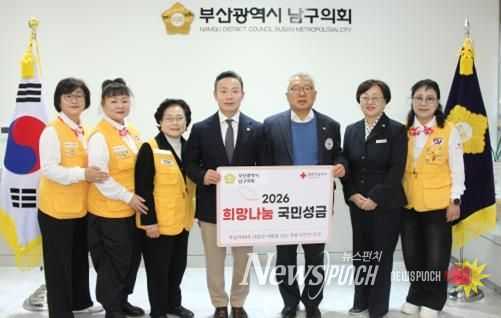 뉴스펀치 김윤걸 기자 | 부산광역시 남구의회는 1월 9일 오전 9시 30분, 남구의회 2층 의장실에서 '2026년도 적십자 희망나눔성금 모금 전달식'을 개최하고 대한적십자사 부산광역시지사에 성금 100만원을 전달했다.