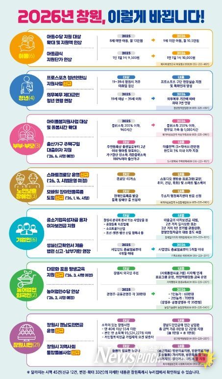 뉴스펀치 박세훈 기자 | 창원특례시는 2026년부터 새롭게 시행되거나 확대·변경되는 주요 시책을 한눈에 볼 수 있도록 정리한 '2026년 달라지는 시책' 책자(전자책 포함)을 발간했다.